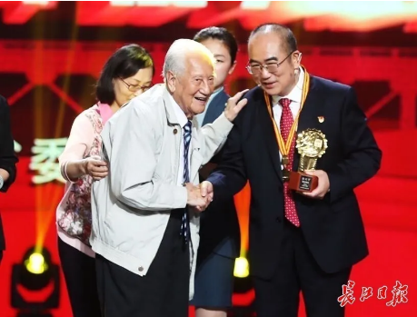 當(dāng)95歲高齡的黃老出現(xiàn)在舞臺(tái)上時(shí),張定宇快步向前迎接,這一幕令人動(dòng)容。黃老在攙扶下,為張定宇戴上獎(jiǎng)?wù)?,“能為你頒獎(jiǎng),我感到很榮幸。你是祖國(guó)的驕傲,人民的英雄!”