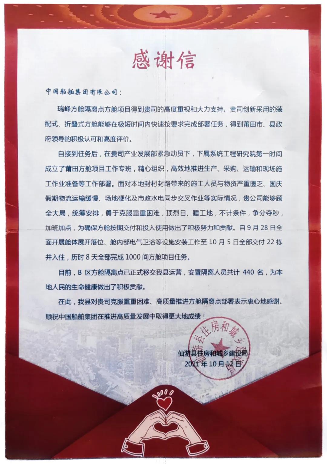 近日,中國船舶集團收到了福建省莆田市仙游縣住房和城鄉(xiāng)建設(shè)局發(fā)來的一封感謝信。