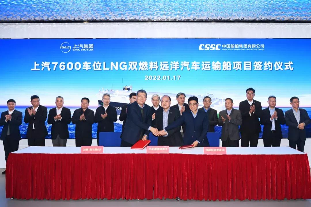 1月17日,中國(guó)船舶集團(tuán)旗下江南造船攜手中船貿(mào)易與上汽集團(tuán)旗下安吉物流簽訂2艘7600車位液化天然氣(LNG)雙燃料遠(yuǎn)洋汽車運(yùn)輸船建造合同。中國(guó)船舶集團(tuán)黨組書記、董事長(zhǎng)雷凡培,上汽集團(tuán)黨委書記、董事長(zhǎng)陳虹出席簽約儀式。