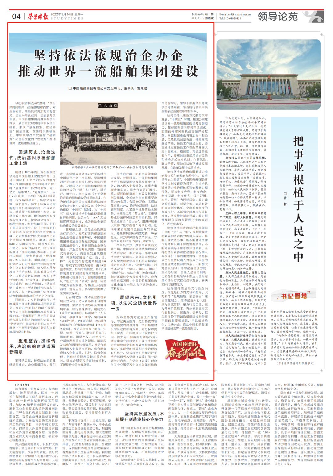 3月14日,《學(xué)習(xí)時(shí)報(bào)》刊發(fā)中國船舶集團(tuán)有限公司黨組書記、董事長雷凡培的署名文章《堅(jiān)持依法依規(guī)治企辦企 推動(dòng)世界一流船舶集團(tuán)建設(shè)》,全文如下: