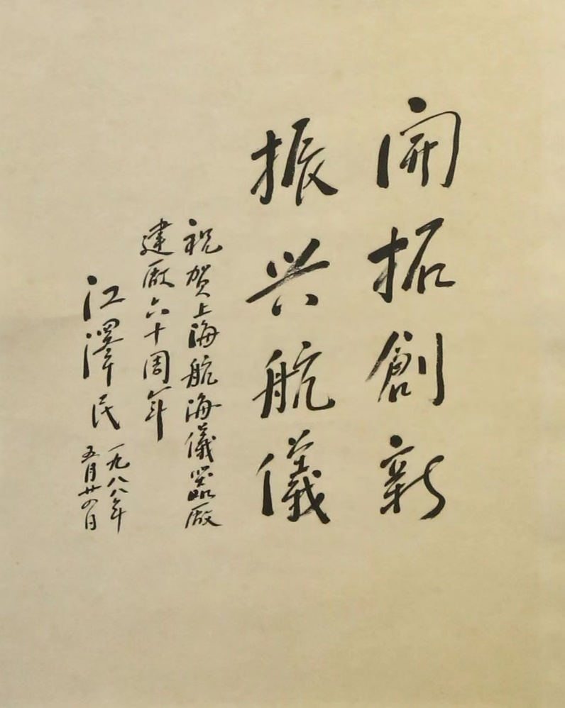江澤民同志曾給系統(tǒng)工程研究院、中船電科旗下中船航海題詞。1988年5月,為慶祝上海航海儀器廠建廠60周年,江澤民同志寫下“開(kāi)拓創(chuàng)新,振興航儀”以示祝賀。