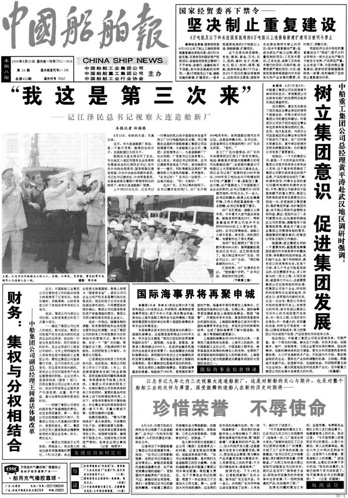 1999年8月20日,《中國(guó)船舶報(bào)》報(bào)道江澤民同志第三次視察大船集團(tuán)。