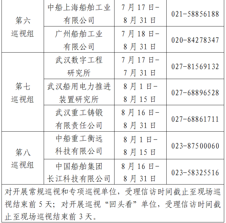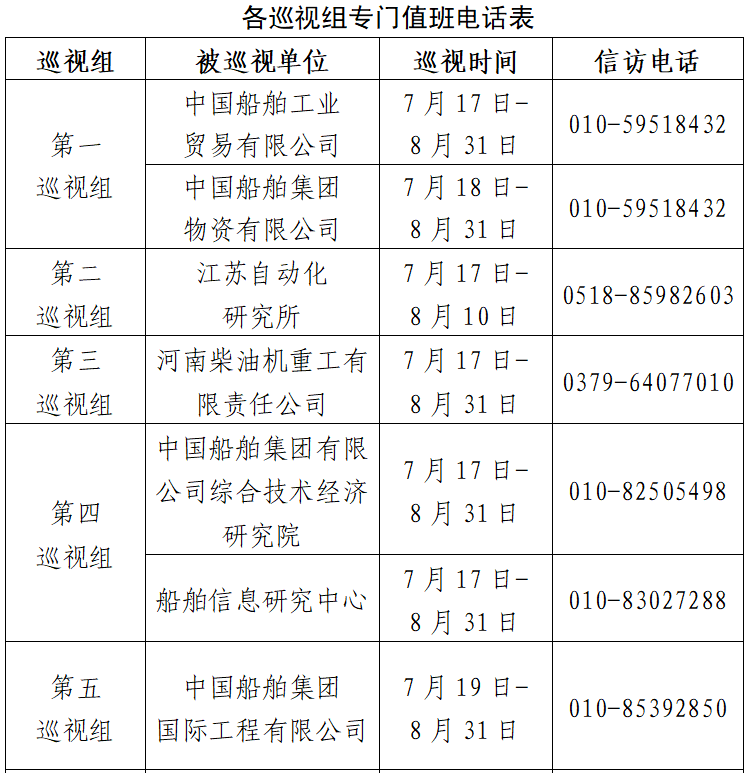 根據(jù)中國船舶集團黨組2023年第一輪巡視工作部署,截至2023年7月17日,巡視工作已經(jīng)鋪開。其中,對中國船舶工業(yè)貿(mào)易有限公司、中國船舶集團物資有限公司、江蘇自動化研究所、河南柴油機重工有限責任公司、中國船舶集團有限公司綜合技術(shù)經(jīng)濟研究院、船舶信息研究中心、中國船舶集團國際工程有限公司等7家單位開展常規(guī)巡視,對中船上海船舶工業(yè)有限公司、廣州船舶工業(yè)有限公司等2家單位開展專項巡視,對武漢數(shù)字工程研究所、武漢船用電力推進裝置研究所、武漢重工鑄鍛有限責任公司、中國船舶集團長江科技有限公司、中船重工衡遠科技有限公司等5家單位開展巡視“回頭看”。