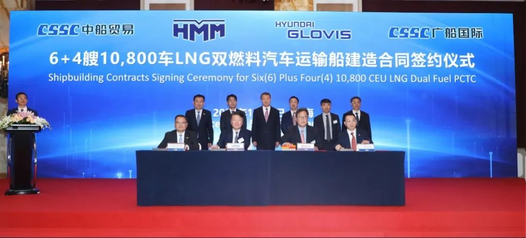 簽約儀式上,外高橋造船、中船貿(mào)易與Seaspan、現(xiàn)代Glovis簽署了6+4艘10800車LNG雙燃料PCTC船項目;廣船國際、中船貿(mào)易與HMM、現(xiàn)代Glovis簽署了6+4艘10800車LNG雙燃料PCTC船項目;北海造船、中船貿(mào)易與北銀金租、山東海運簽署了4艘325000噸超?型甲醇雙燃料礦砂船項目;江南造船、中船貿(mào)易與太平洋氣體簽署了3艘99000方VLEC船項目;黃埔文沖、中船貿(mào)易與Benelux公司簽署了2+1艘48000方LPG船項目;中船澄西、中船貿(mào)易與工銀金租簽署了4艘82600噸散貨船項目;大連造船與七二五所青島雙瑞簽署了15000TEU集裝箱船甲醇供應(yīng)系統(tǒng)項目。