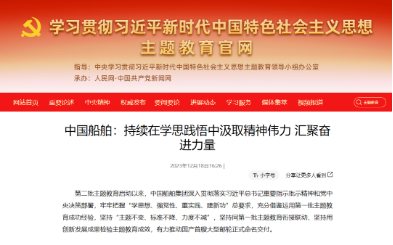 12月18日,學(xué)習(xí)貫徹習(xí)近平新時代中國特色社會主義思想主題教育官網(wǎng)發(fā)布《中國船舶:持續(xù)在學(xué)思踐悟中汲取精神偉力 匯聚奮進(jìn)力量》。中國船舶集團(tuán)通過繪好“施工圖”、念好“三字經(jīng)”、用好“五字訣”等扎實開展好主題教育,切實以主題教育成果推動集團(tuán)公司加快建設(shè)世界一流船舶集團(tuán)。