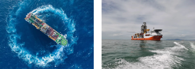 # 通過配置最先進的DP-3級動力定位系統(tǒng),自動調(diào)整船舶底部7臺推進器的轉(zhuǎn)向和推力大小,來抵抗海上風(fēng)、浪、流作用在船上的載荷,使船舶在海上保持一定的水平位置;