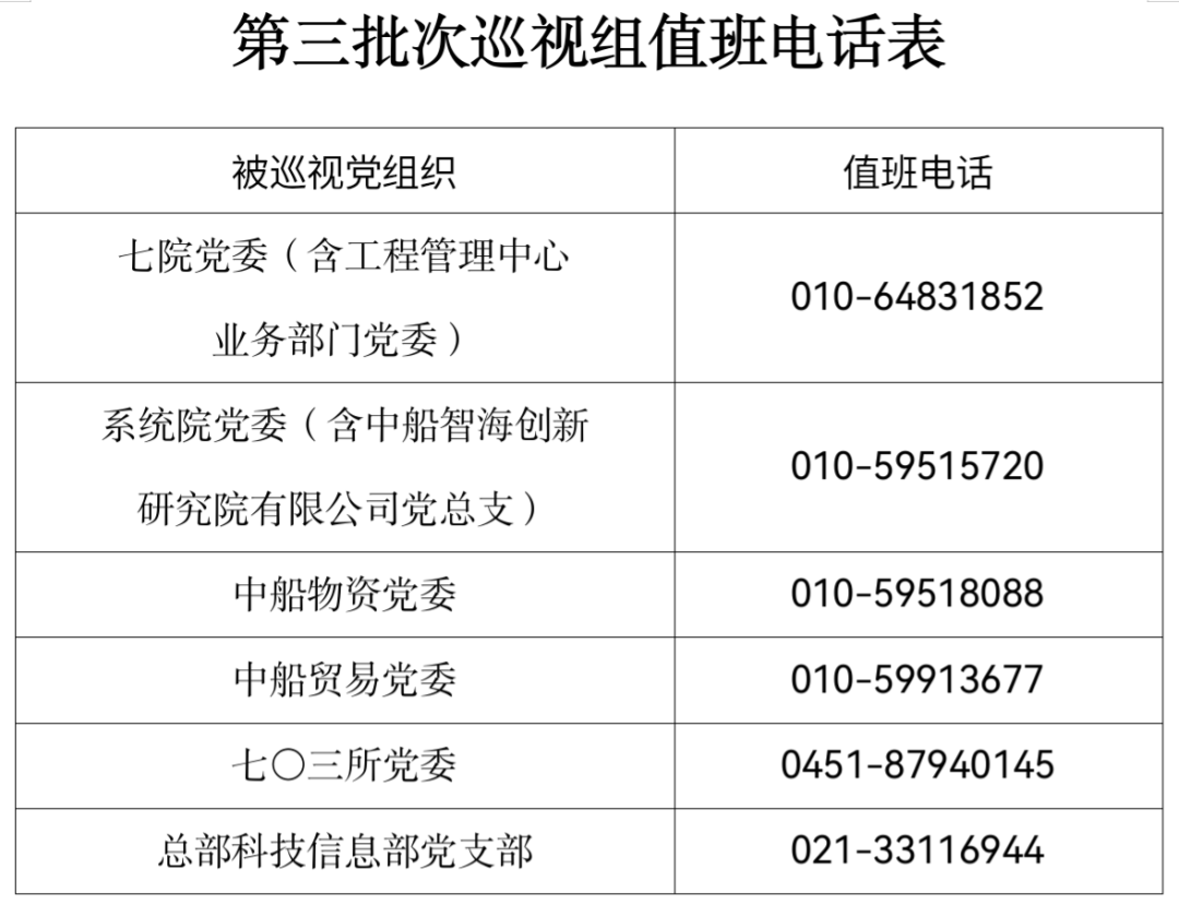 巡視期間,集團(tuán)公司黨組巡視組設(shè)置值班電話和聯(lián)系信箱,主要受理反映被巡視黨組織領(lǐng)導(dǎo)班子及其成員、下一級(jí)黨組織領(lǐng)導(dǎo)班子主要負(fù)責(zé)人和重點(diǎn)崗位領(lǐng)導(dǎo)干部問(wèn)題的來(lái)信、來(lái)電、來(lái)訪,重點(diǎn)關(guān)注違反政治紀(jì)律、組織紀(jì)律、廉潔紀(jì)律、群眾紀(jì)律、工作紀(jì)律、生活紀(jì)律以及巡視整改等方面問(wèn)題反映。第三批次巡視受理信訪截止時(shí)間為9月22日。