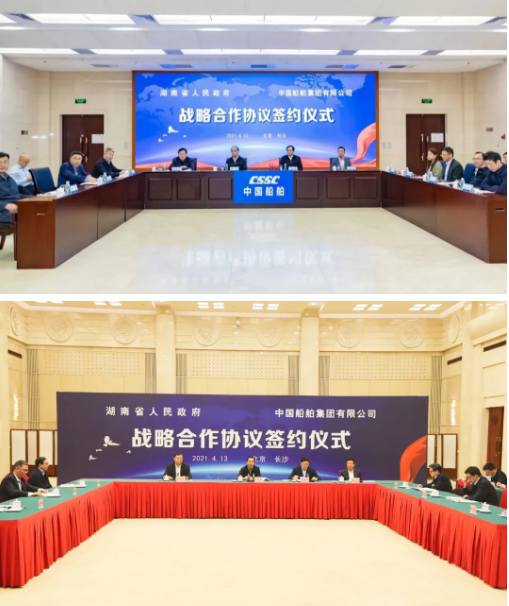 4月13日,中國船舶集團(tuán)有限公司與湖南省人民政府通過“云簽約”方式簽署戰(zhàn)略合作協(xié)議。中國船舶集團(tuán)黨組書記、董事長雷凡培,黨組副書記、總經(jīng)理?xiàng)罱鸪?,黨組成員、副總經(jīng)理盛紀(jì)綱,湖南省委書記、省人大常委會(huì)主任許達(dá)哲,省委常委、省委秘書長張劍飛,省委常委、省國資委黨委書記姚來英出席簽約儀式。中國船舶集團(tuán)黨組成員、副總經(jīng)理錢建平,湖南省人民政府副省長陳飛分別代表雙方在協(xié)議上簽字。簽約前,雙方圍繞共同服務(wù)國家戰(zhàn)略、深入推進(jìn)雙方戰(zhàn)略合作進(jìn)行了交流。