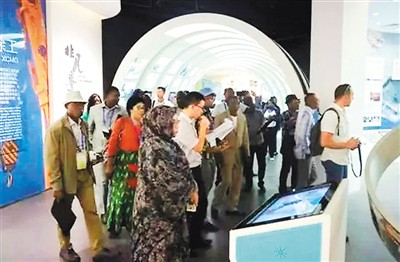 來(lái)自非洲12個(gè)發(fā)展中國(guó)家基礎(chǔ)設(shè)施建設(shè)及規(guī)劃相關(guān)部門的高級(jí)官員在徐工集團(tuán)展廳內(nèi)參觀。