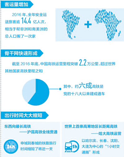 編織一張密度適宜的高鐵網(wǎng)絡(luò),造福盡可能多的民眾。十八大以來,我國高鐵版圖不斷延伸:2013年7月,穿越江南水鄉(xiāng)的寧杭高鐵開通;2014年6月,世界上一次性建成通車?yán)锍套铋L的高速鐵路蘭新高鐵建成通車;2016年12月,滬昆高鐵全線通車,彩云之南不再“邊緣”。截至2016年底,中國高鐵運(yùn)營里程突破2.2萬公里,超過世界其他國家高鐵里程之和,除幾條線路外,2004年提出的“四縱四橫”高鐵網(wǎng)已全部建成。根據(jù)2016年7月新修訂的國家《中長期鐵路網(wǎng)規(guī)劃》(2016-2030年),預(yù)計(jì)到2020年,全國高速鐵路將增加到3萬公里。今年繼續(xù)保持高鐵網(wǎng)絡(luò)快速建設(shè)勢頭,就在上月初,寶蘭高鐵通車,將使千年絲路煥發(fā)更加蓬勃的生機(jī)。不久后,我們還將見證張呼客專馳騁于遼闊的大草原,而西成高鐵也將讓千年蜀道不再艱難。