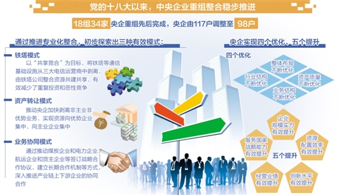 黨的十八大以來,中央企業(yè)的重組整合,成為國企改革的重要內(nèi)容。5年來,中央企業(yè)的重組整合穩(wěn)步推進(jìn),國務(wù)院國資委先后完成18組34家央企重組,央企由117戶調(diào)整至98戶。