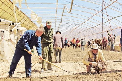 馬學濤(左一)與村民們一起在大棚種沙棘。(王 箐攝)