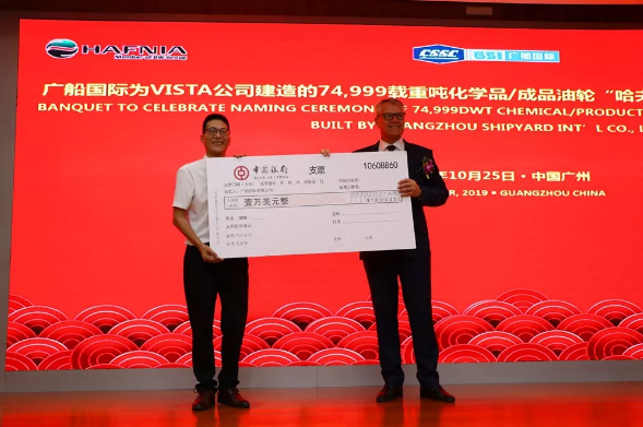 10月25日,廣船國際有限公司為VISTA公司建造的7.5萬噸化學(xué)品/成品油船4號(hào)船命名交付。這是廣船國際在“決戰(zhàn)120天,掀起生產(chǎn)高潮”勞動(dòng)競(jìng)賽中收獲的又一枚勝利果實(shí)。該船比合同交船期提前43天交付,船東為此專門獎(jiǎng)勵(lì)廣船國際1萬美元。
