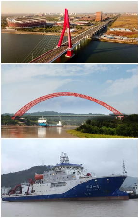 ????上圖所示均為武船集團承建的項目。圖1:遼寧盤錦遼濱沿海經濟開發(fā)區(qū)大橋;圖2:四川合江長江一橋;圖3:我國自主研制的第一艘載人潛水器支持母船“深海一號”。