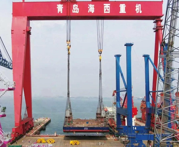 ????在該項(xiàng)目的前期建造策劃階段,海西重機(jī)沒(méi)有采用常規(guī)船塢下水或滑移下水方式,而是大膽提出利用1600噸龍門吊整體吊裝下水的設(shè)想。經(jīng)過(guò)一系列重量預(yù)估及方案論證,最終核定吊裝下水重量接近1440噸。