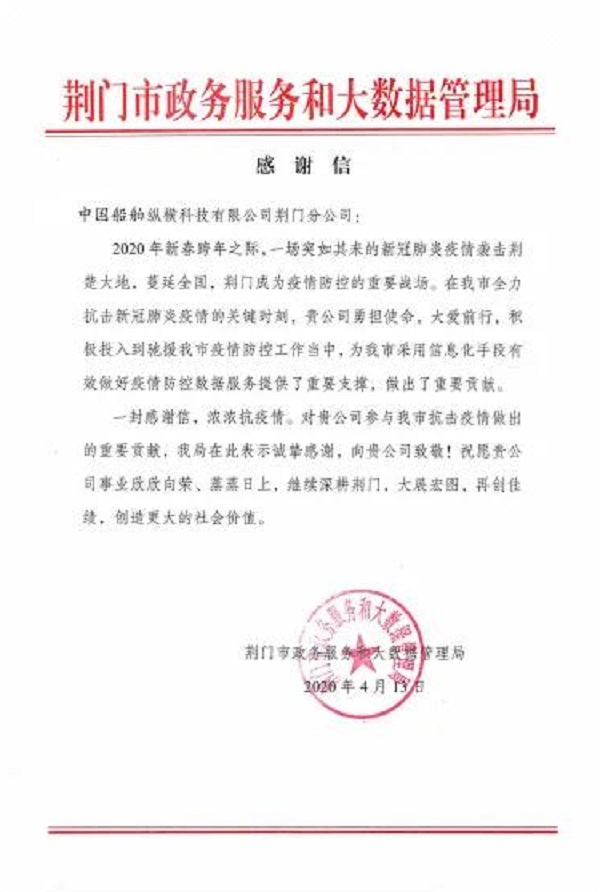 ????中國船舶集團七一〇所縱橫公司荊門分公司收到荊門市政務服務和大數(shù)據(jù)管理局寄來的感謝信,感謝其在抗擊新冠肺炎疫情的關鍵時刻,為荊門市采用信息化手段有效做好疫情防控數(shù)據(jù)服務提供了重要支撐,作出了重要貢獻。