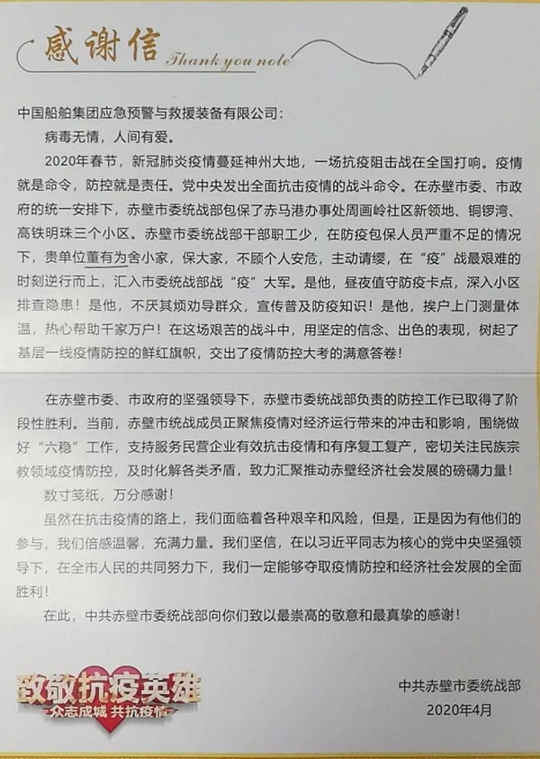 ????中共赤壁市委統(tǒng)戰(zhàn)部特向中國船舶集團旗下中國應急發(fā)來感謝信,對中國應急員工董有為舍小家保大家,不顧個人安危,主動請纓,在戰(zhàn)“疫”最艱難的時刻逆行而上表示感謝和致敬。