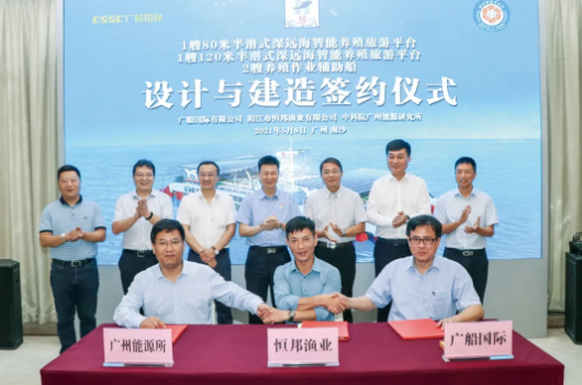 5月8日,中國(guó)船舶集團(tuán)旗下廣船國(guó)際 與廣東省陽(yáng)江市恒邦漁業(yè)有限公司簽訂1艘80米半潛式深遠(yuǎn)海智能養(yǎng)殖旅游平臺(tái)建造合同,這是廣東省首個(gè)商業(yè)化大型半潛式養(yǎng)殖旅游綜合平臺(tái)。