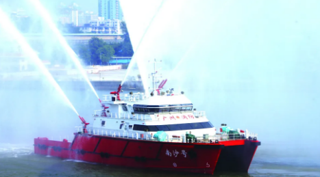 2010年12月28日,廣船國際為南沙區(qū)建造的“南沙號”消防船投入使用。“南沙號”消防船總長46米,型寬15米,排水量達(dá)到680噸,航速可達(dá)32.4公里/小時,共設(shè)置有6門水炮。其中,2門主炮射程可達(dá)到150米,4門副炮射程可達(dá)到130米;還設(shè)置了全船水幕保護(hù)系統(tǒng),在火災(zāi)現(xiàn)場可有效保護(hù)自身安全。“南沙號”消防船是當(dāng)時國內(nèi)最大雙體專勤消防船,大大增強(qiáng)了對船舶火災(zāi)、石化碼頭、油庫火災(zāi)的撲救能力。