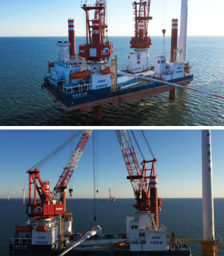 中國船舶集團(tuán)建造的“中船海工101”號風(fēng)電安裝平臺正在海上作業(yè)
