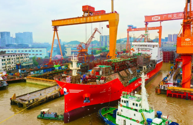 中國船舶集團(tuán)旗下黃埔文沖建造的9500立方米雙燃料動力多用途氣體運輸船首制船在近日出塢。