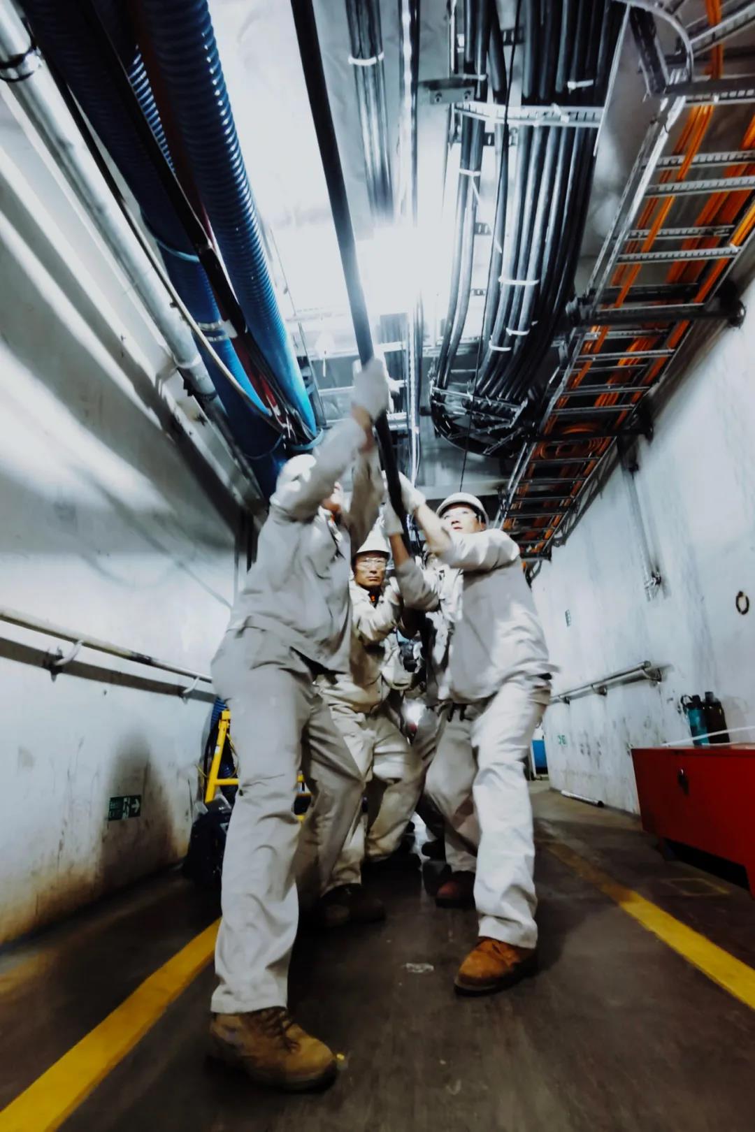 目前已完成全船總段制作和搭載的首制國(guó)產(chǎn)大型郵輪H1508很快將迎來(lái)全船結(jié)構(gòu)貫通,外高橋造船的工人們正在艙內(nèi)加班加點(diǎn)抓緊敷設(shè)電纜。