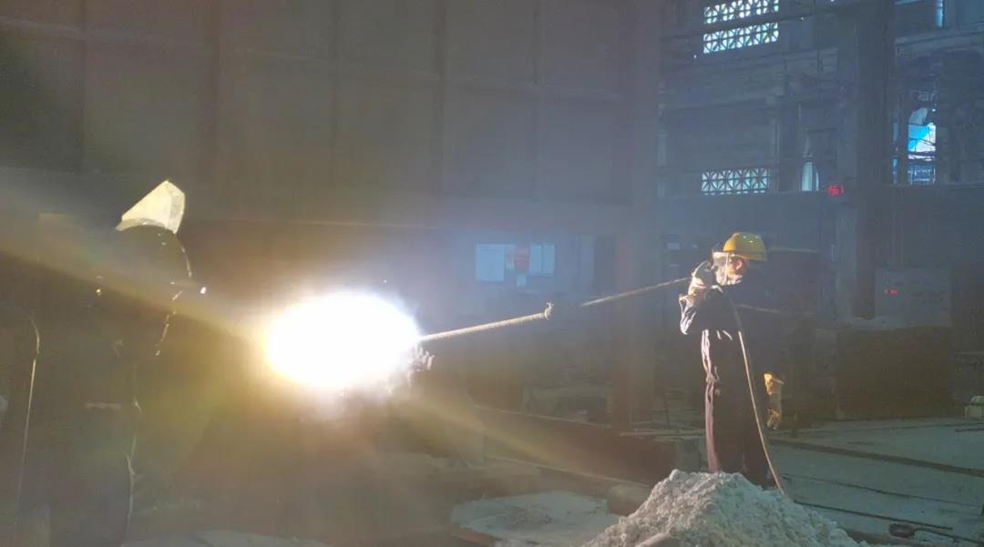 煉鋼工人為確保鋼水質(zhì)量,提高生產(chǎn)效率進(jìn)行吹氧工序,鋼水溫度達(dá)1600余攝氏度。
