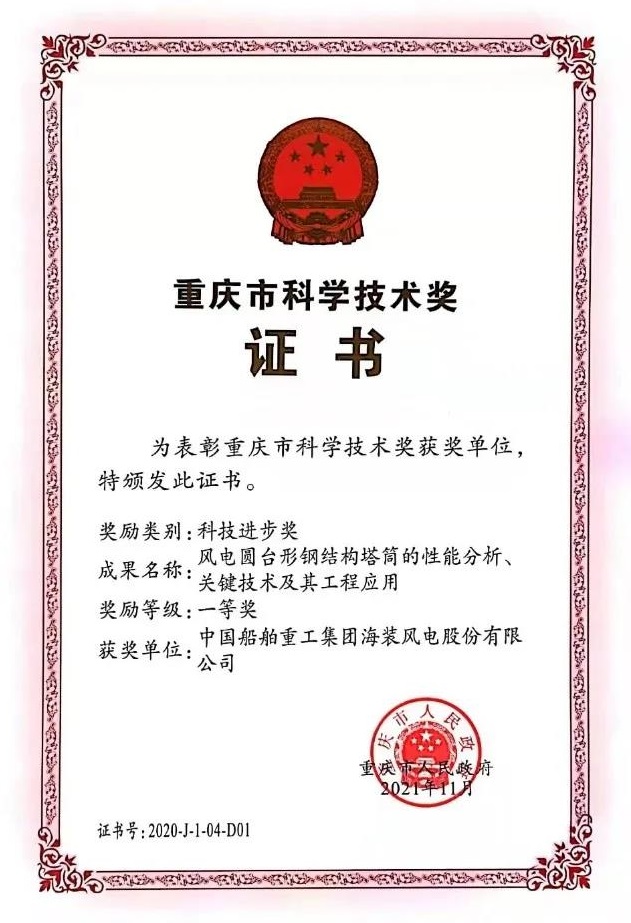 中國船舶集團旗下中國海裝申報的兩項成果《高效安全大型風電機組傳動鏈關(guān)鍵技術(shù)與應(yīng)用》《風電圓臺形鋼結(jié)構(gòu)塔筒的性能分析、關(guān)鍵技術(shù)及其工程應(yīng)用》榮獲重慶市科技進步獎一等獎。