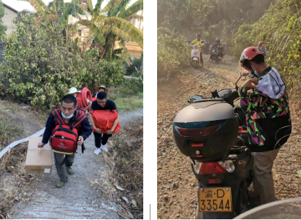 在重慶40多度的高溫天氣下,他們有的為當?shù)鼐栀浀V泉水和食物等物資;有的加入挖隔離帶的隊伍中;有的在后方將物資運送到統(tǒng)一堆放點;山勢陡峭,有的則是成為“摩托幫”,將物資送到最前線。