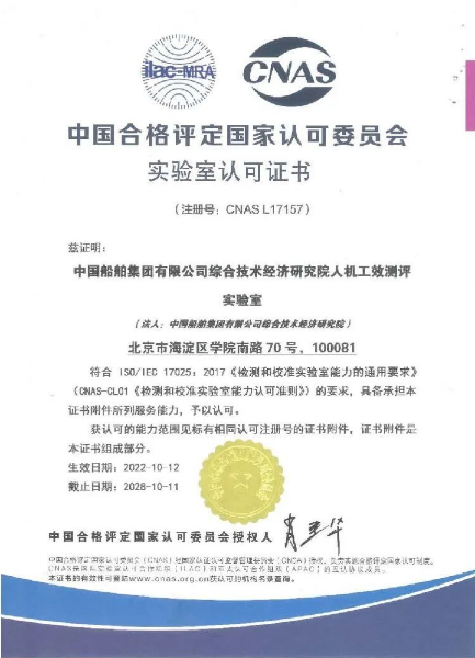 近日,中國(guó)船舶集團(tuán)旗下中船綜合院人機(jī)工效測(cè)評(píng)實(shí)驗(yàn)室(以下簡(jiǎn)稱“實(shí)驗(yàn)室”)獲得中國(guó)合格評(píng)定國(guó)家認(rèn)可委員會(huì)(CNAS)實(shí)驗(yàn)室認(rèn)可證書,成為國(guó)內(nèi)首家具備國(guó)家認(rèn)可人機(jī)工效測(cè)評(píng)能力的試驗(yàn)機(jī)構(gòu)。