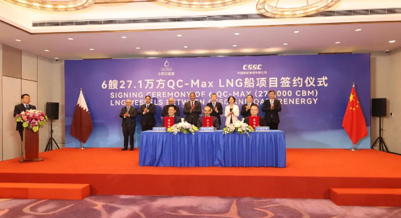 9月9日,三方新簽了6艘全球最大27.1萬立方米超大型LNG船訂單。至此,三方已累計簽訂24艘27.1萬立方米超大型LNG船、12艘17.4萬立方米大型LNG船,以載氣量計,位居全球各船廠之首??ㄋ柲茉词聞?wù)國務(wù)大臣、卡塔爾能源總裁兼首席執(zhí)行官薩阿德·謝里達(dá)·阿爾卡比,上海市副市長陳杰,中國船舶集團(tuán)黨組成員、總會計師賈海英等出席簽約儀式。