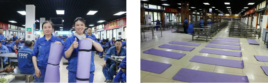 中午時(shí)分,走進(jìn)廣船國(guó)際生產(chǎn)指揮樓食堂,十幾臺(tái)空調(diào)已經(jīng)提前開(kāi)啟,食堂內(nèi)涼爽舒適。據(jù)介紹,該公司已經(jīng)將會(huì)議室、食堂等公共區(qū)域開(kāi)放給一線員工作為午間的“休憩港灣”,讓一線員工得以安心小憩、恢復(fù)體力。13個(gè)食堂內(nèi),除了不銹鋼凳子、桌子可以供員工躺下休息之外,還為員工準(zhǔn)備了瑜伽墊。