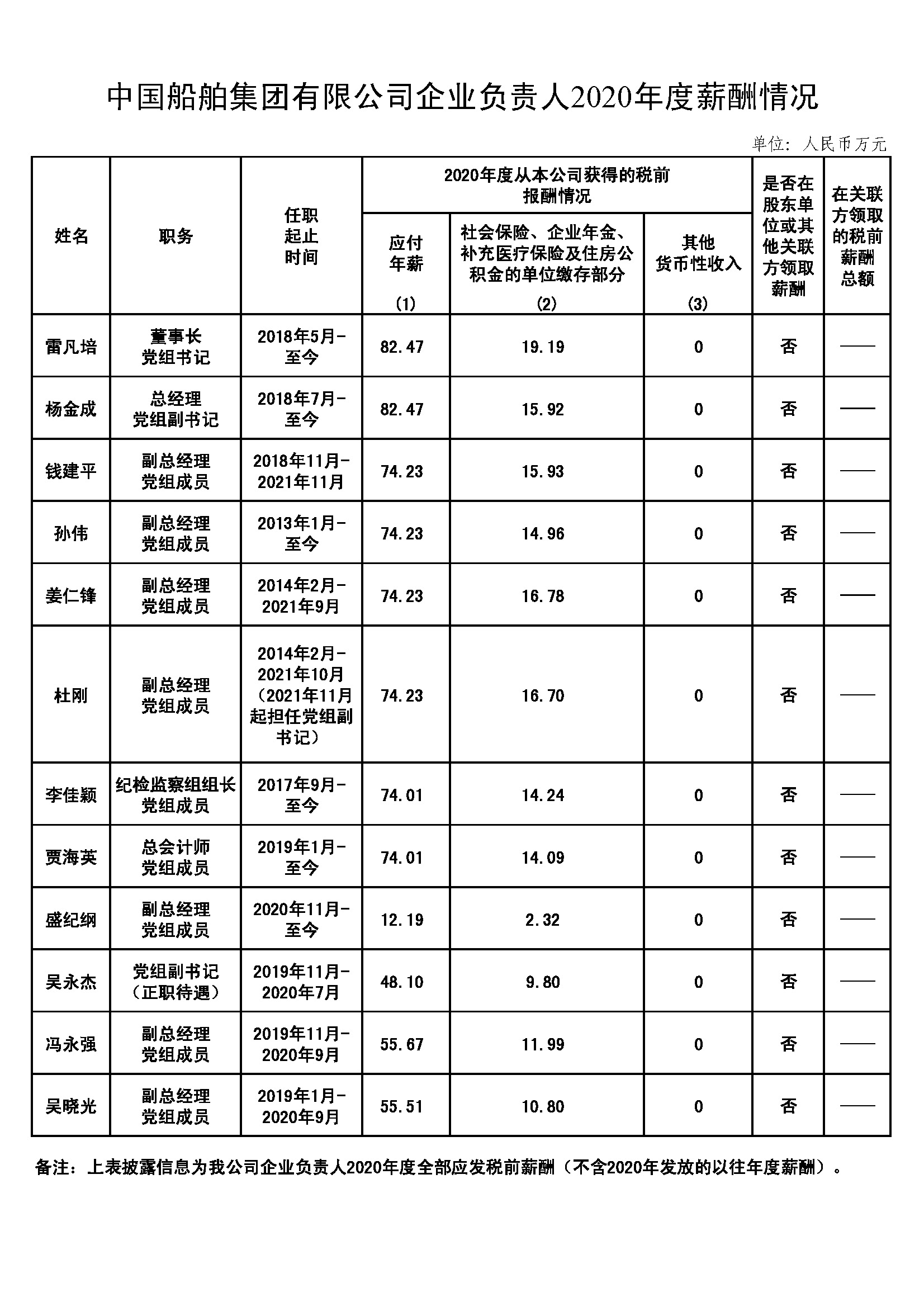 中國船舶集團(tuán)有限公司企業(yè)負(fù)責(zé)人2020年度薪酬情況