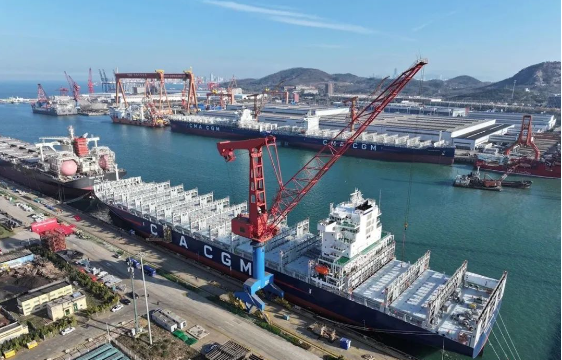 12月3日,中國船舶集團青島北海造船與中船貿(mào)易作為聯(lián)合賣方,為達飛海運建造的系列5500TEU集裝箱船“CMA CGM KAURI”號舉行命名交付儀式。該船是北海造船交付的第8艘5500TEU集裝箱船,也是北海造船年度交付的第19艘船。