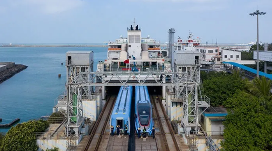 搭載2組復(fù)興號動車組過海的是“粵海鐵1號”“粵海鐵2號”火車渡船。這2艘船均由中國船舶集團(tuán)旗下七〇八所設(shè)計、江南造船建造,其中,“粵海鐵1號”是我國第一艘自行設(shè)計、自行建造的跨?;疖嚩纱摯?003年1月投入運(yùn)營,結(jié)束了海南島與外省不通火車的歷史。