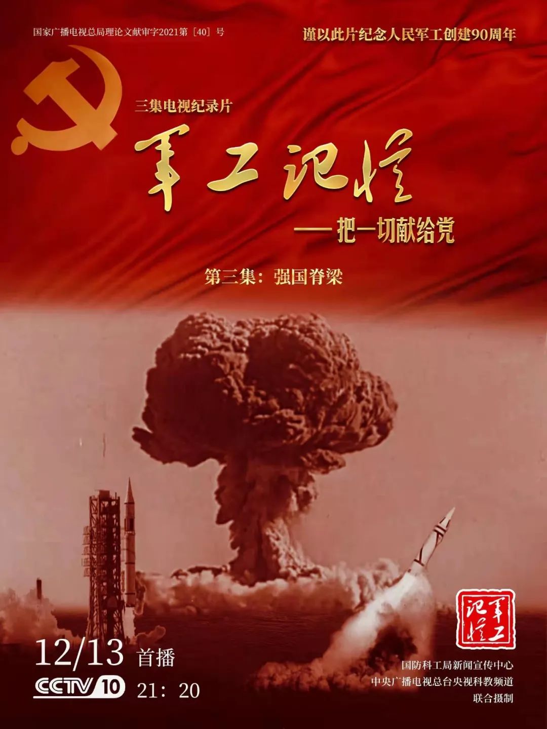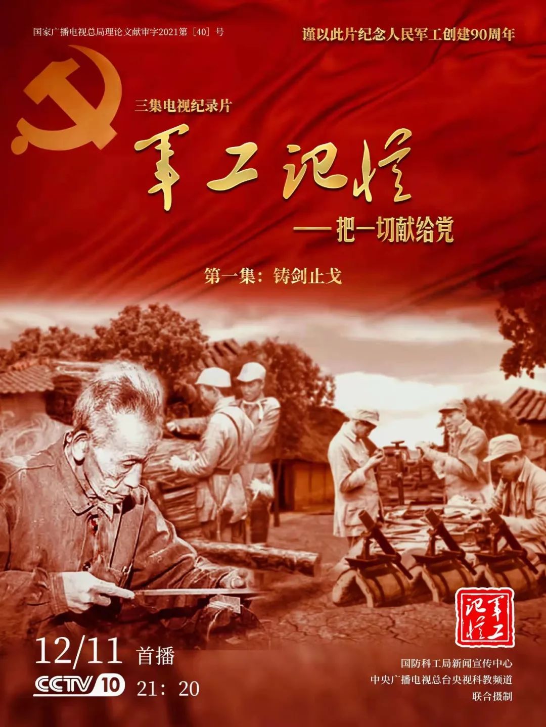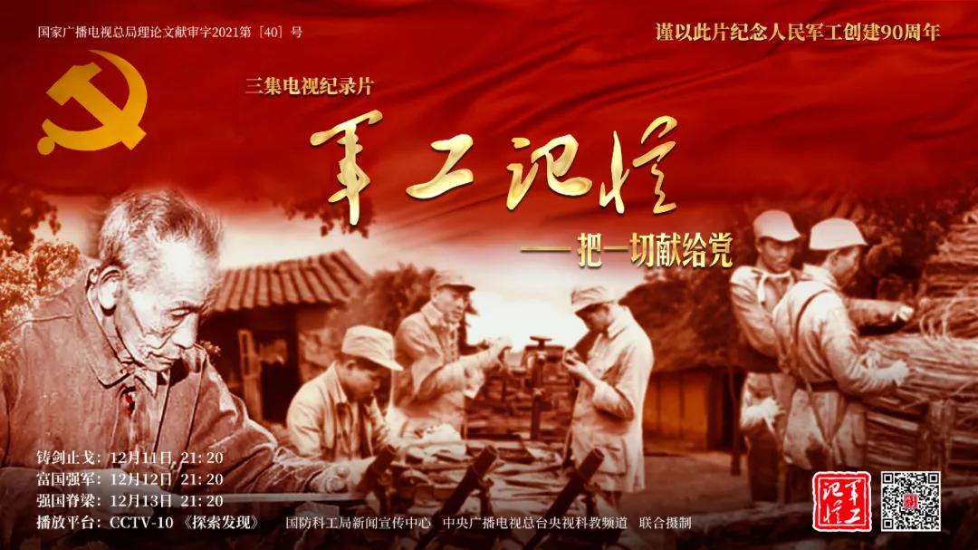 為慶祝中國共產(chǎn)黨成立100周年,紀念黨領導下的人民軍工創(chuàng)建90周年,由國防科工局指導,國防科工局新聞宣傳中心聯(lián)合中央廣播電視總臺社教節(jié)目中心攝制,各軍工集團大力支持的3集重大理論文獻電視紀錄片《軍工記憶——把一切獻給黨》,將于12月11日21:20在央視科教頻道(CCTV-10)《探索發(fā)現(xiàn)》欄目首播,連續(xù)播出3天。該紀錄片旨在向建黨百年獻禮,向人民軍工90周年致敬,向全社會弘揚軍工精神傳遞軍工文化,激勵國防科技工業(yè)戰(zhàn)線廣大干部職工不忘初心、接續(xù)奮斗,為實現(xiàn)強軍強國夢想貢獻力量。
