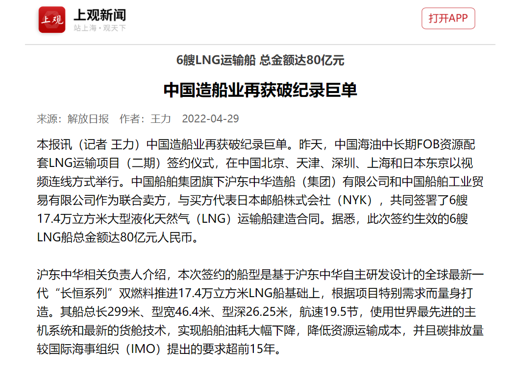 這次簽約生效的6艘LNG船總金額達(dá)80余億元人民幣,再次刷新了今年年初創(chuàng)造的LNG船一次性合同金額最大訂單紀(jì)錄。至此,今年前4個月滬東中華已累計承接LNG船訂單達(dá)到創(chuàng)歷史紀(jì)錄的17艘,超越韓國船企傲居全球之首,在實現(xiàn)簽單質(zhì)量和數(shù)量“雙提升”的同時,進(jìn)一步鞏固了滬東中華在中國LNG產(chǎn)業(yè)鏈的龍頭地位和領(lǐng)跑優(yōu)勢。