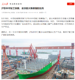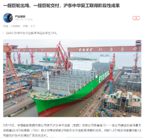 5月19日,中國船舶集團(tuán)旗下滬東中華雙喜臨門。其建造的全球最大裝箱量24000TEU超大型集裝箱船2號船在長興造船基地順利出塢;建造的13000噸多用途重吊船12號船在浦東廠區(qū)命名交付,標(biāo)志著該項(xiàng)目圓滿收官。這是滬東中華自復(fù)工復(fù)產(chǎn)以來首次實(shí)現(xiàn)一天完成兩大生產(chǎn)節(jié)點(diǎn)。