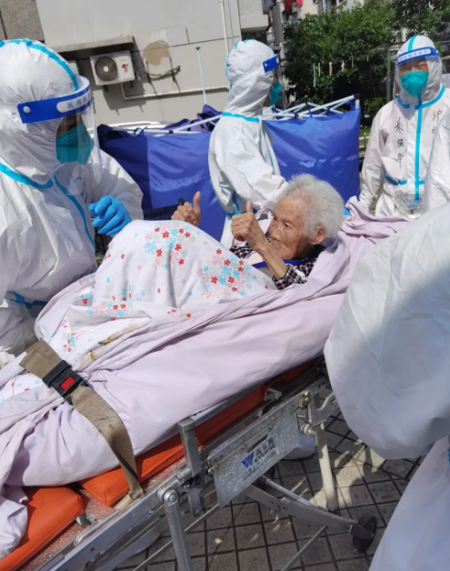 “我們是穿著防護(hù)服進(jìn)去的,突然看到這么多‘大白’,老人們不免有些緊張,問的最多的就是‘去哪里’。隨著我們一趟趟幫著老人下樓、上車,老人們開始逐漸信任我們。因?yàn)檗D(zhuǎn)運(yùn)的部分老人中存在核酸異常的情況,有些老人還會時(shí)不時(shí)關(guān)照我們要注意防護(hù)。幫他們送上救護(hù)車時(shí),老人還和我們連聲表示感謝?!碧镅┟髡f道。