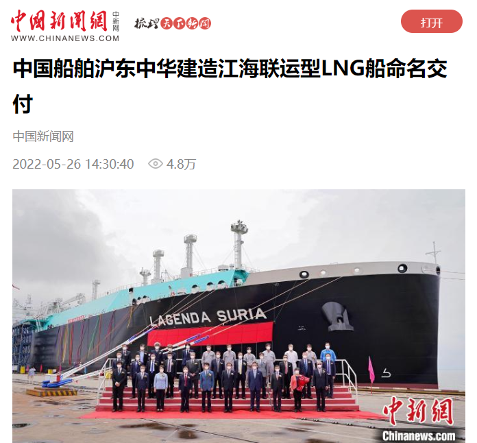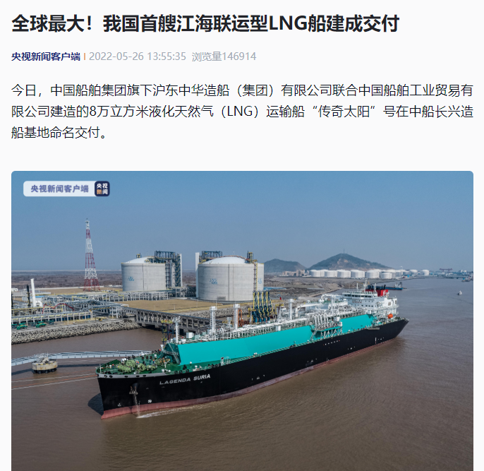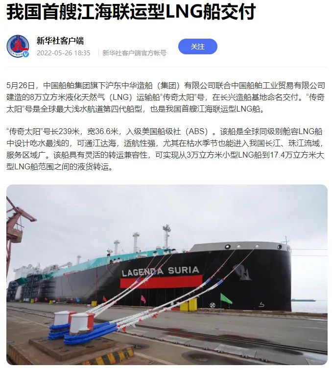 5月26日,中國(guó)船舶集團(tuán)旗下滬東中華聯(lián)合中船貿(mào)易建造的8萬(wàn)立方米液化天然氣(LNG)運(yùn)輸船“傳奇太陽(yáng)”號(hào)在長(zhǎng)興造船基地命名交付。“傳奇太陽(yáng)”號(hào)是全球最大淺水航道第四代、我國(guó)首款首制首艘江海聯(lián)運(yùn)型LNG船,填補(bǔ)了中國(guó)淺水航道LNG船的空白,在該細(xì)分市場(chǎng)占有率最高,有望成為中國(guó)船舶制造的又一精品船型。