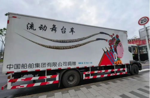在中國(guó)船舶廣場(chǎng)揭牌儀式現(xiàn)場(chǎng),一輛印有中國(guó)船舶集團(tuán)有限公司捐贈(zèng)的流動(dòng)舞臺(tái)車格外醒目,工作人員告訴記者:“過去送文化下鄉(xiāng)巡回演出,由于需要不斷改變巡演地點(diǎn),刮風(fēng)下雨就只能‘望雨興嘆’,現(xiàn)在有了移動(dòng)舞臺(tái)車,10分鐘內(nèi)就將所有設(shè)備安裝到位,并且車內(nèi)預(yù)留了燈光、聲音、字幕、幕布、電源等接口,具有很好的擴(kuò)展性,車上的舞臺(tái)滿足了專業(yè)演出的需求,可以讓整個(gè)演出更具表演性,舞臺(tái)車可以直接開進(jìn)百姓家,鄉(xiāng)親們家門口就能看表演,感謝中國(guó)船舶集團(tuán)讓文化下鄉(xiāng)不再難?!臂屡D縣民族文化工作隊(duì)隊(duì)長(zhǎng)安飄感激地說:“感謝中國(guó)船舶集團(tuán)對(duì)邊疆文化的關(guān)心,我們一定會(huì)守好文化邊疆!”。