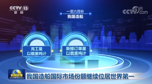 7月17日,央視《新聞聯(lián)播》對(duì)我國(guó)造船國(guó)際市場(chǎng)份額繼續(xù)位居世界第一進(jìn)行了報(bào)道。數(shù)據(jù)顯示,一至六月份,我國(guó)造船完工量、新接訂單量、手持訂單量,以載重噸計(jì)分別占世界總量的45.2%、50.8%和47.8%,國(guó)際市場(chǎng)份額繼續(xù)位居世界第一。