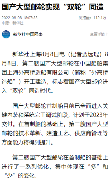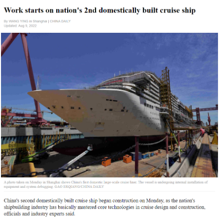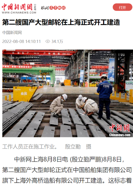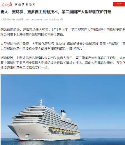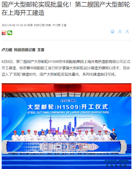 8月8日,第二艘國(guó)產(chǎn)大型郵輪在中國(guó)船舶集團(tuán)旗下外高橋造船開(kāi)建,這標(biāo)志著中國(guó)船舶工業(yè)已初步掌握大型郵輪設(shè)計(jì)建造關(guān)鍵核心技術(shù)。
