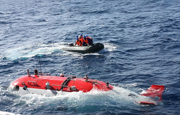 △2012年蛟龍?zhí)?000米級海試 蛙人正在靠近蛟龍?zhí)?