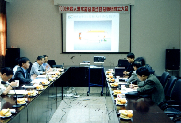 △7000米載人潛水器總體組及總師組成立大會,發(fā)言者為徐芑南。