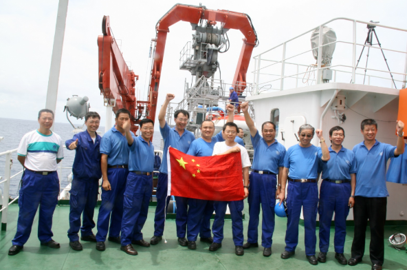 △蛟龍?zhí)栂聺?000米海試合影 徐芑南(右三)、葉聰(中)