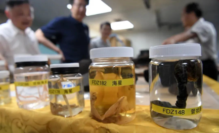 3月11日,“探索一號”科考船攜“奮斗者”號全海深載人潛水器抵達三亞,科研人員在介紹采集的深淵宏生物、巖石、結核、沉積物樣品。新華社記者 陳凱姿 攝