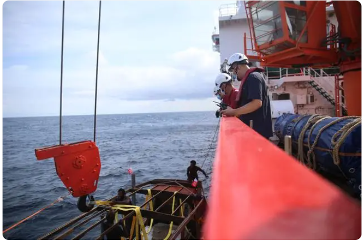 確定交接地點(diǎn)、制定求救人員登船保障方案、聯(lián)系當(dāng)?shù)睾J潞瓦厵z部門(mén)報(bào)備……一系列工作相繼完成,吊裝工作開(kāi)始。