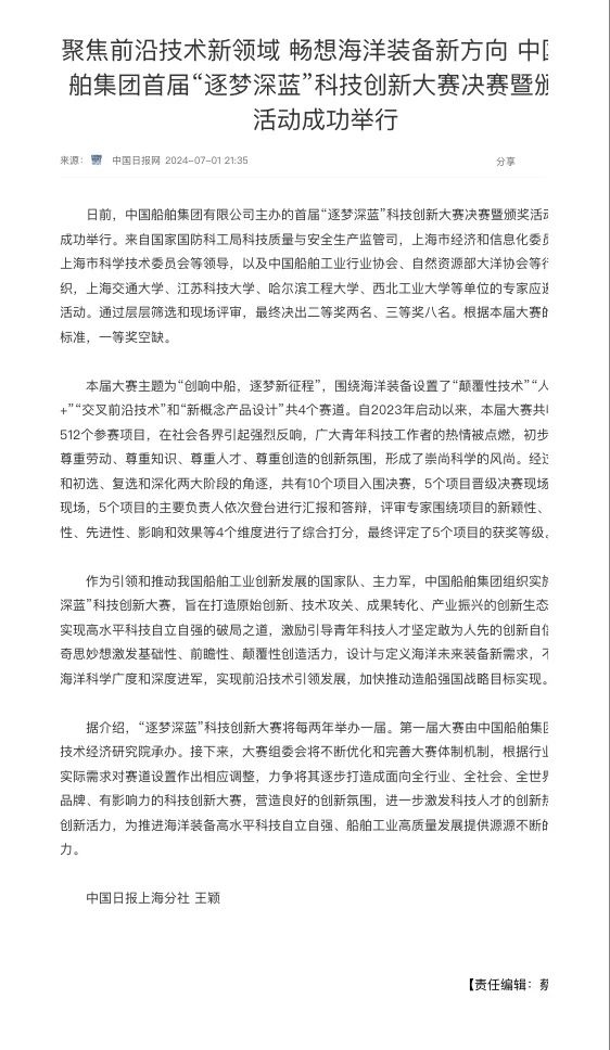 中國船舶集團有限公司主辦的首屆“逐夢深藍”科技創(chuàng)新大賽決賽暨頒獎活動引來各大媒體的關(guān)注,獲得高度評價。——>活動回顧