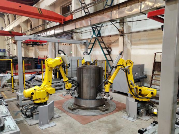 近日,中國船舶集團旗下杰瑞自動化承研的定子鐵芯疊裝機器人工作站項目通過驗收并投入使用,實現了大型高壓異步電機關鍵配套——定子鐵芯的自動化生產。